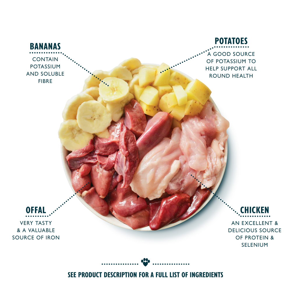Vores ernæringsmæssigt komplette restitutionsmåltid er en kornfri opskrift lavet af en beroligende kombination af ingredienser, herunder frisk tilberedt kylling, banan og kartoffel, samt præbiotika FOS og MOS, der hjælper med at støtte fordøjelsessystemet.